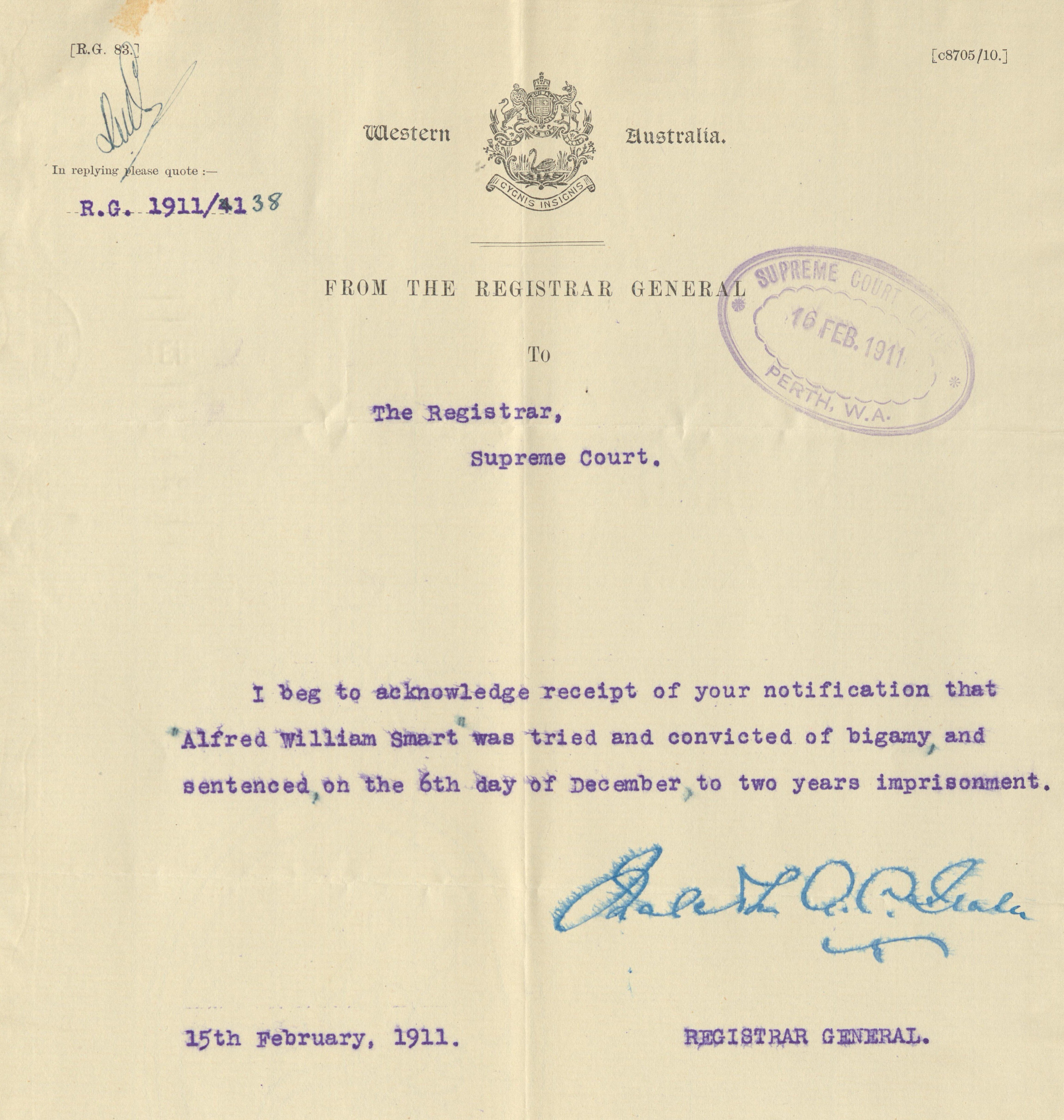 “I think, for MĂ©lanie’s purposes, it provides such a great reason why we do keep these records so we can look to these past cases and understand what was going on 100 years ago or more.”The Supreme Court record of Smart’s bigamy charge, 1910.(Supplied: State Records Office WA)none