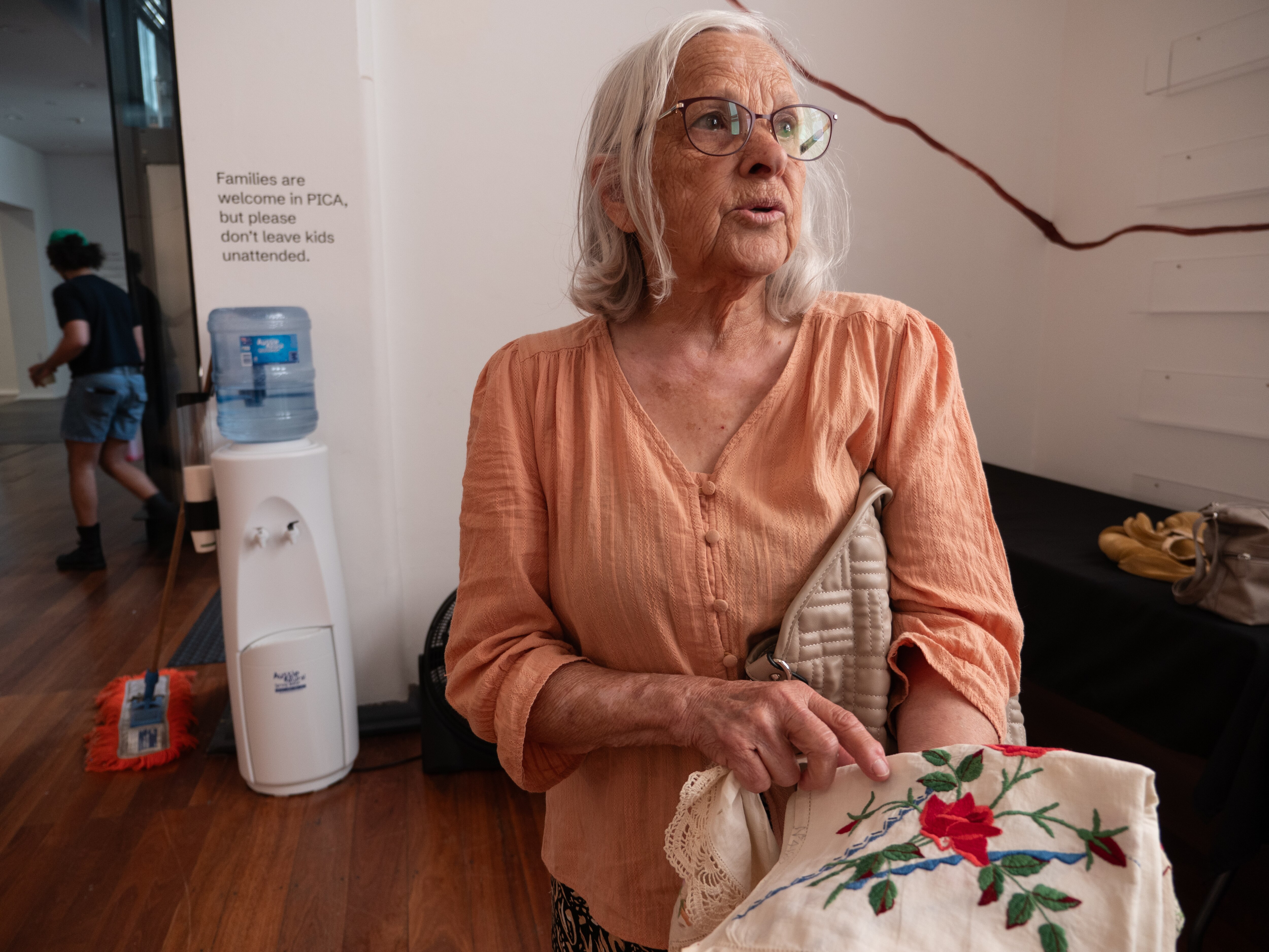 Fittingly, she’s brought the embroidery along on her visit to see her granddaughter’s latest work, a large-scale mural on the ground floor at Perth Institute of Contemporary Art (PICA).