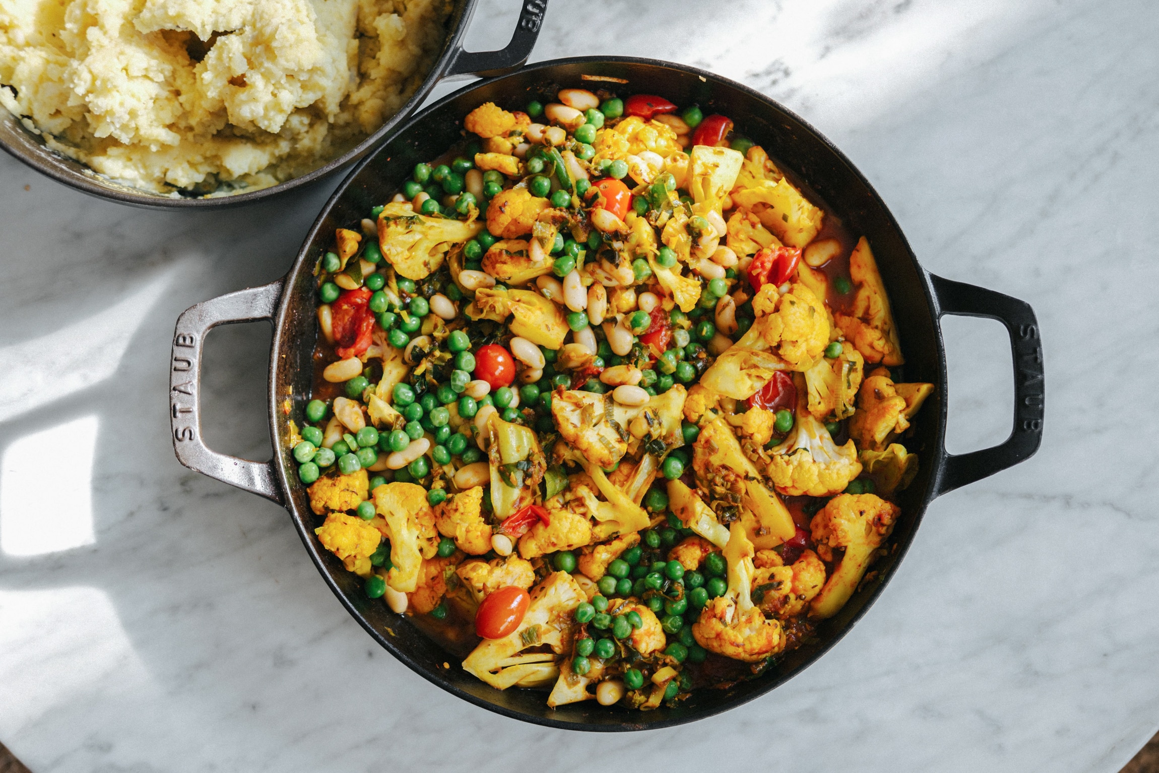The dish is inspired by the flavours and spirit of the beloved North Indian dish aloo gobi matar: a potato, cauliflower and pea curry. I’ve remixed the elements, creating a cauliflower and pea curry that is topped with mashed potatoes, in a firm nod to another classic: cottage and shepherd’s pie.