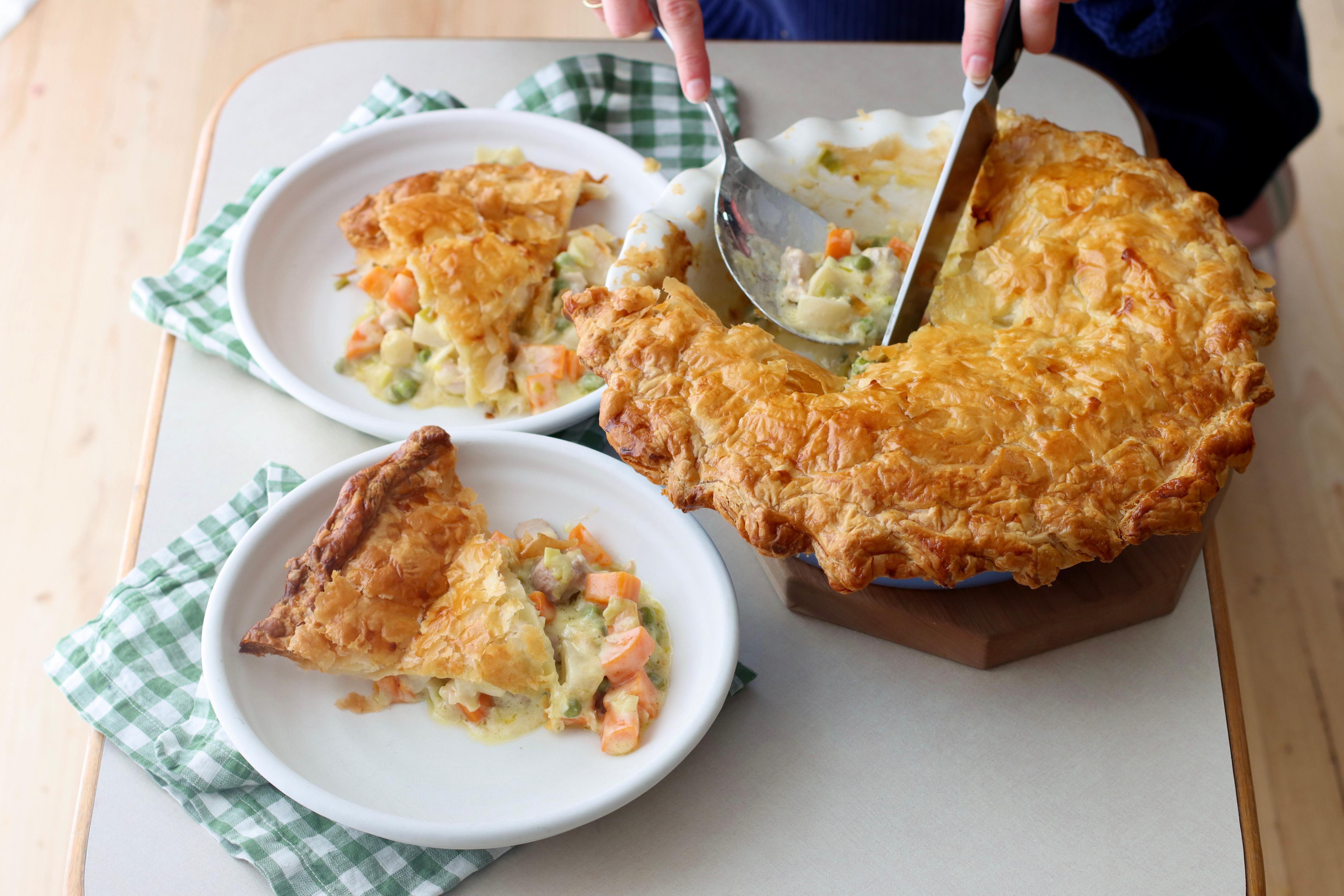 - You can prepare the pie ahead of time by cooking the chicken and vegetables as instructed, pouring them into the pie dish, and allowing them to cool completely before adding the pastry lid. Store the prepared pie, covered with cling film, in the fridge until you’re ready to bake, then pop it in the preheated oven until the filling is cooked through and the top golden (cover the top with foil if the pastry is done but the filling is not steaming). You can also freeze the unbaked pie, just defrost overnight in the fridge before baking.