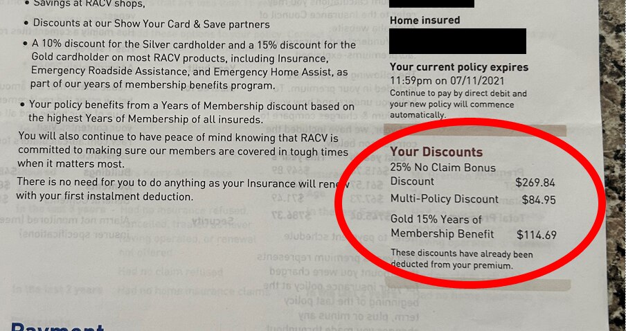 Her recent renewal notice said she has “gold membership” status, which entitled her to a 15 per cent discount, a multi-policy discount, and a no-claim bonus equating to hundreds of dollars in savings.